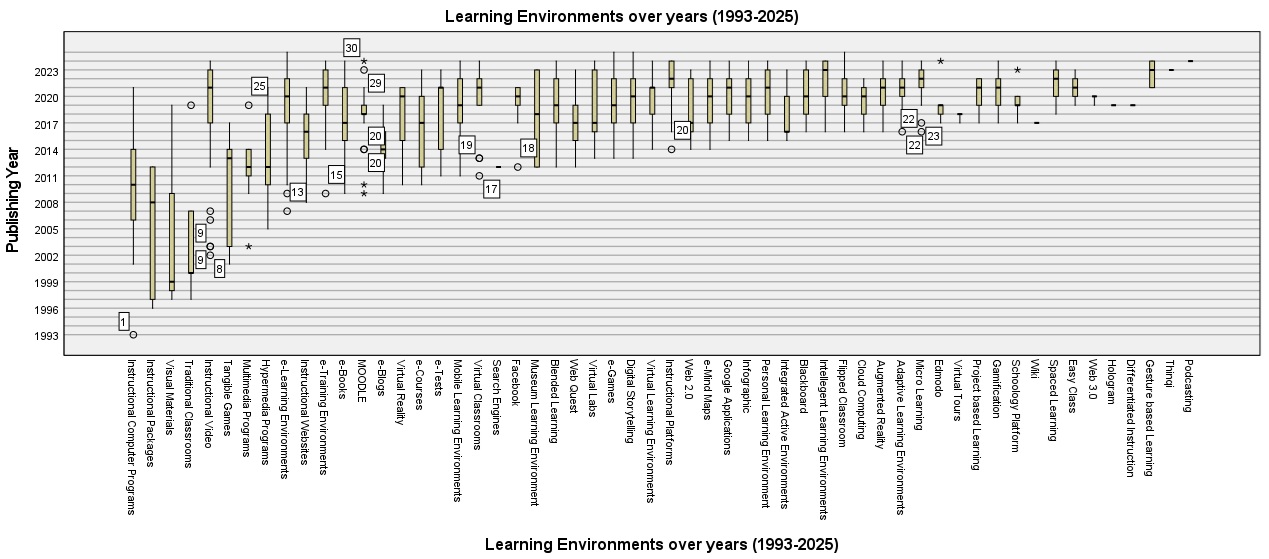 بيئات التعلم الافتراضيةVirtual Learning Environments (26) : انتشرت تلك البيئات في الفترة من (2014) وحتى (2024)، وتركزت في الفترة من (2018) وحتى (2021) بمعنى استمرار استخدامها حتى الأن، وقد يعود البدء في انتشارها إلى ظهور تلك التطبيقات الجاهزة التي يسرت إلى حد كبير بناء وتصميم وإنتاج واستخدام تلك البيئات الافتراضية التي يستخدم فيها الأفاتار الذي يمثل كل فرد كوكيل تعليمي عنه ضمن بيئات تعلم تشاركية