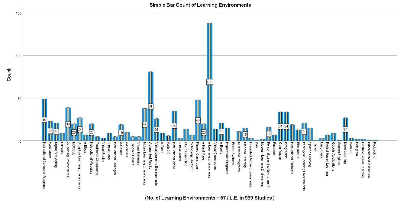 · ثم تأتي بقية بيئات التعلم التي كان عدد مرات استخدامها في البحوث أقل من (10) بحوث وهي على الترتيب تنازلياً: منصة أدمودو، المعامل الافتراضية، الاختبارات الإلكترونية، تطبيقات جوجل، المدونات الإلكترونية، منصة سكولوجي، الفيسبوك، التعلم القائم على المشروعات، الجيل الثاني للويب، الفصول التقليدية، الرزم أو الحقائب التعليمية، الألعاب المادية الملموسة، المواد التعليمية البصرية، الواقع الافتراضي، الجولات الافتراضية، بيئات التعلم المتكاملة، منصة أيزي كلاس، الجيل الثالث للويب، بيئات التعلم المتحفية، الهولوجرام، التعلم القائم على الإيماءات، الويكي منصة ثينكي، محركات البحث، التعليم المتمايز، البودكاست